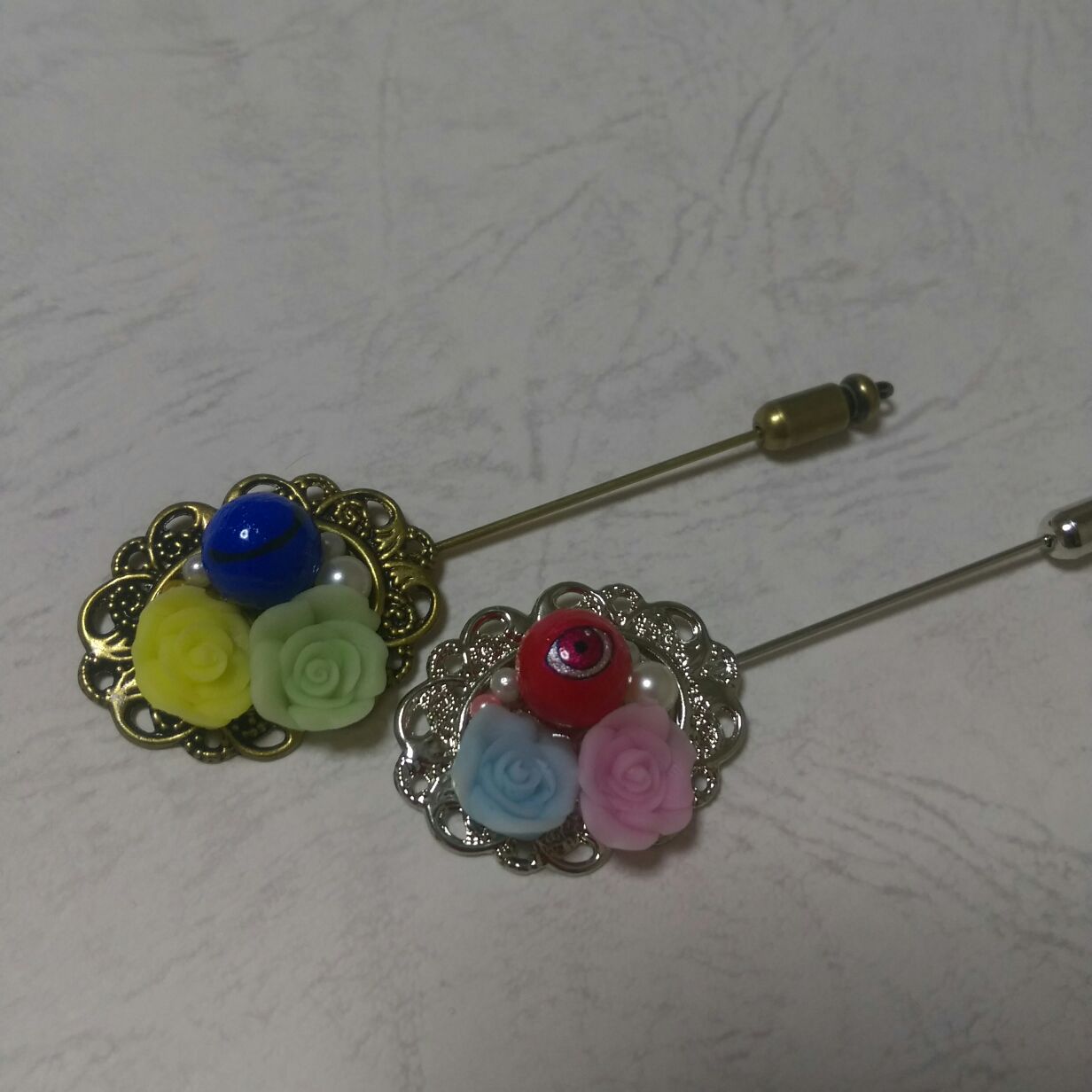 さとりとこいしモチーフのピンブローチ。