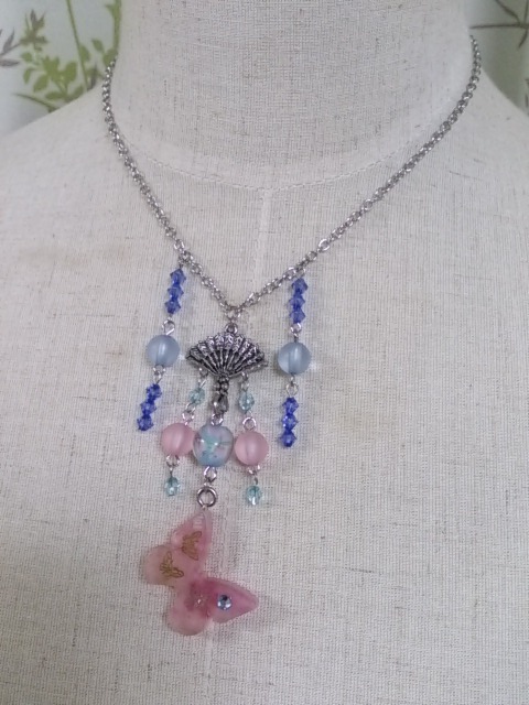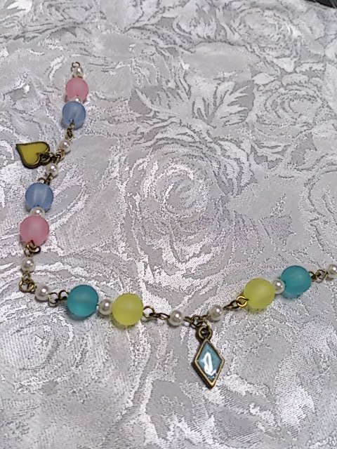 真ん中の花模様が入ったビーズは、蛍光灯の下だとピンク色ですが、白熱灯の下だと青く見えます。