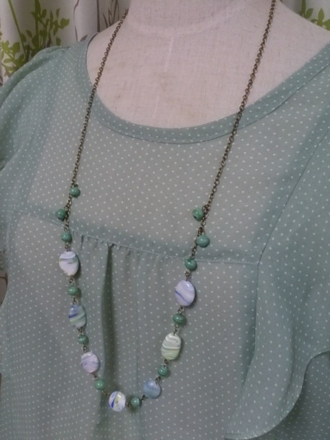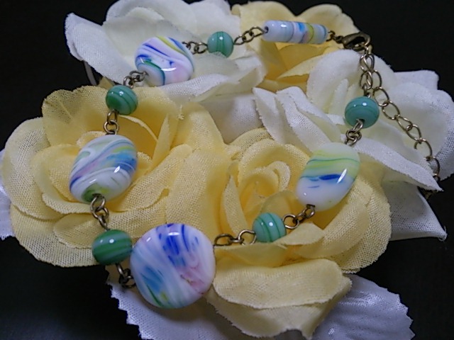平たいとんぼ玉でネックレスとブレスレット作りました。
